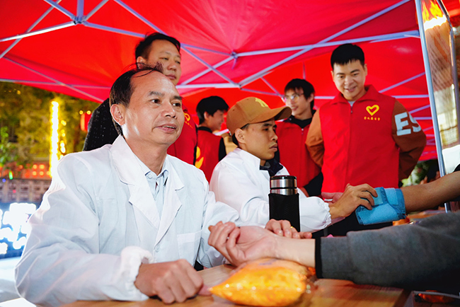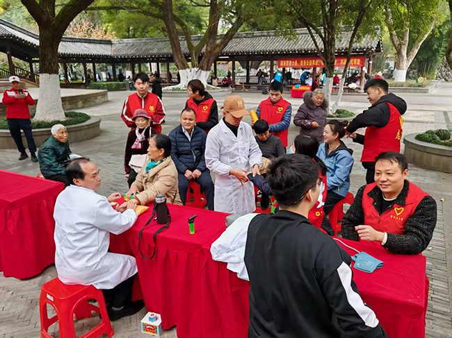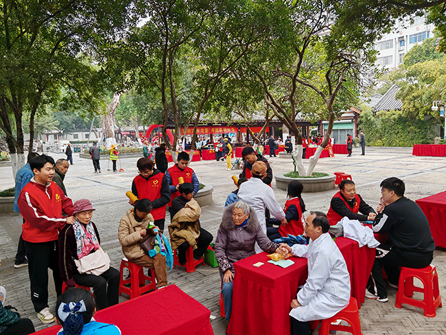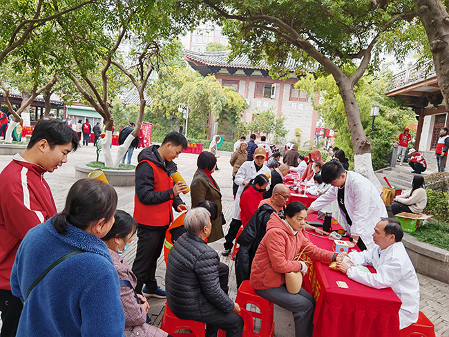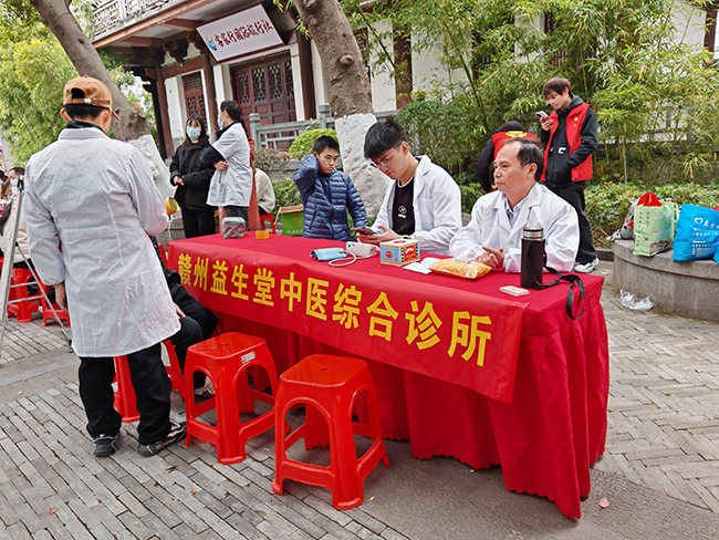 江西赣州崇义中医执业医师谢文淦携义工团队在两场活动中均设立公益义诊专区,为市民提供中医问诊、推拿理疗、健康科普、测量血压等服务。活动现场,谢文淦耐心为群众把脉问诊,针对市民常见问题提供专业建议,并让市民免费体验艾灸。