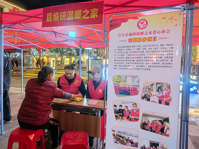 12月4日晚,“那年•崇义”文创街区灯光璀璨,首场志愿服务活动在此拉开帷幕。次日,志愿服务活动移至赣州市公园,延续温暖。活动由崇义县新时代文明实践中心、县委宣传部、县委社会工作部等单位联合主办,通过文艺展演、便民服务、健康咨询等多元形式,弘扬“奉献、友爱、互助、进步”的志愿精神。